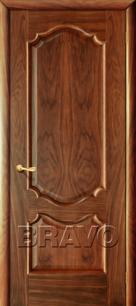 Отделка полотна: натуральный шпон американского ореха, двухкомпонентный полиуретановый лак Цвет: Американский орех Каркас полотна: брус хвойных пород Внутреннее заполнение: МДФ Багет: массив березы, шпон березы Толщина: 40 мм Высота: 2000 мм Ширина: 600, 700, 800, 900 мм