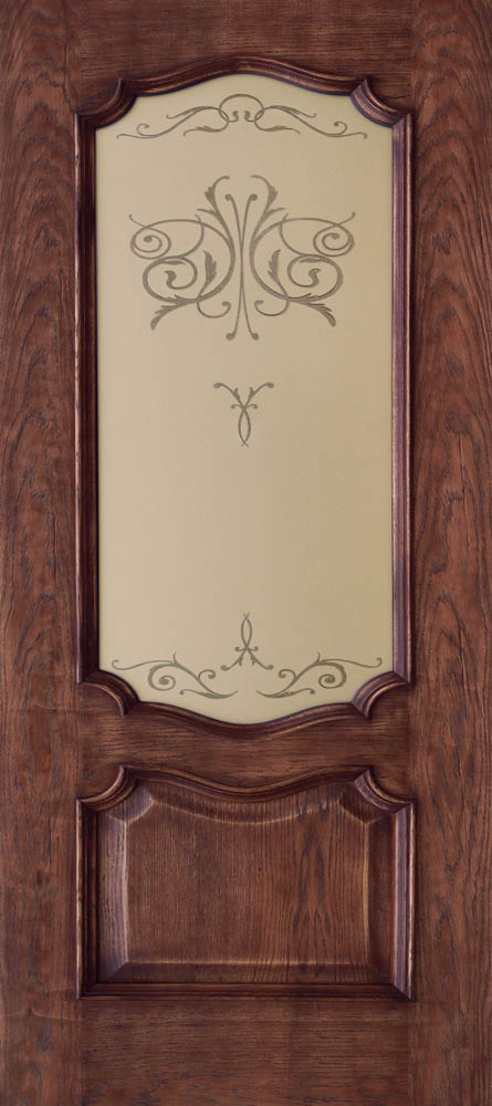 Отделка полотна: натуральный шпон дуба, двухкомпонентный полиуретановый лак, патина Цвет: Платина голд Стекло: Бронза Художественное Каркас полотна: брус хвойных пород Внутреннее заполнение: МДФ Багет: массив дуба Толщина: 40 мм Высота: 2000 мм Ширина: 600, 700, 800, 900 мм