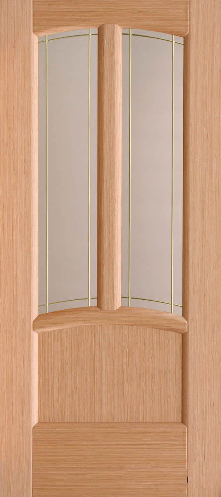 Отделка полотна: шпон дуба файн-лайн, двухкомпонентный полиуретановый лак Цвет: Дуб Стекло: Сатинато Белое, витражная техника Каркас полотна: брус хвойных пород Внутреннее заполнение: МДФ Толщина: 40 мм Высота: 2000 мм Ширина: 600, 700, 800, 900 мм